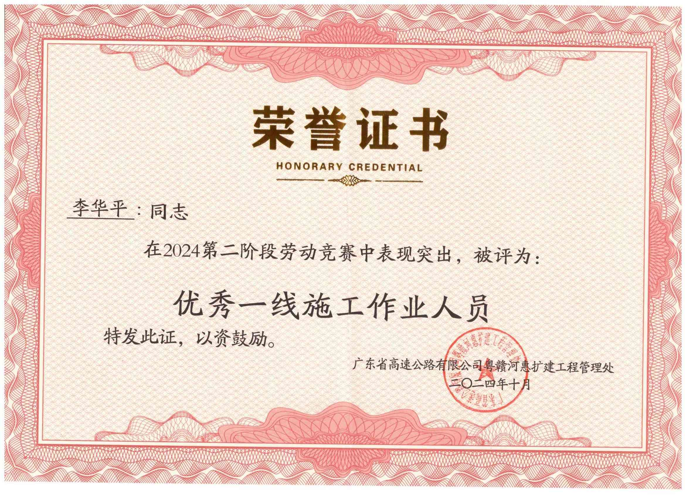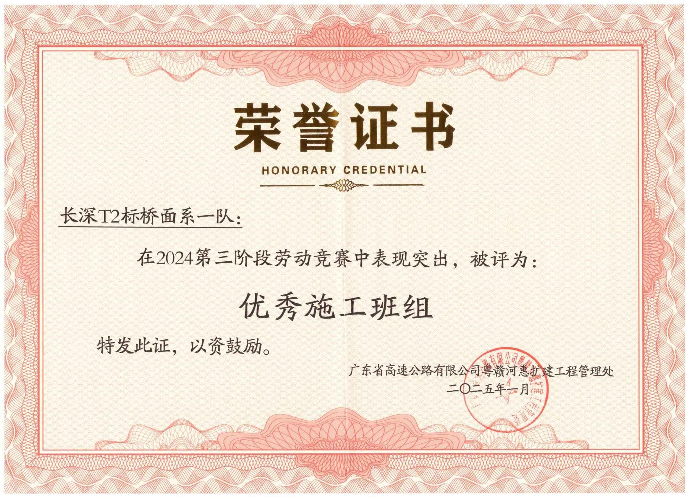 2025年1月,成都利方再度获评中铁大桥局第九工程有限公司“核心层优秀劳务分包企业”。同期,我公司广东长深高速扩建工程T2项目部,参与业主方广东省高速公路有限公司粤赣河惠扩建工程管理处主办的2024年第二、三阶段劳动竞赛,凭借优异表现荣获第三阶段“优秀施工班组”称号,我方项目部负责人李华平,以专业素质和领导力,连续两次获评“优秀一线施工作业人员”。