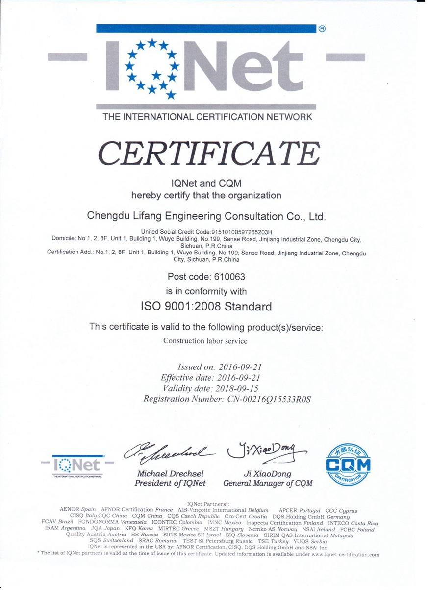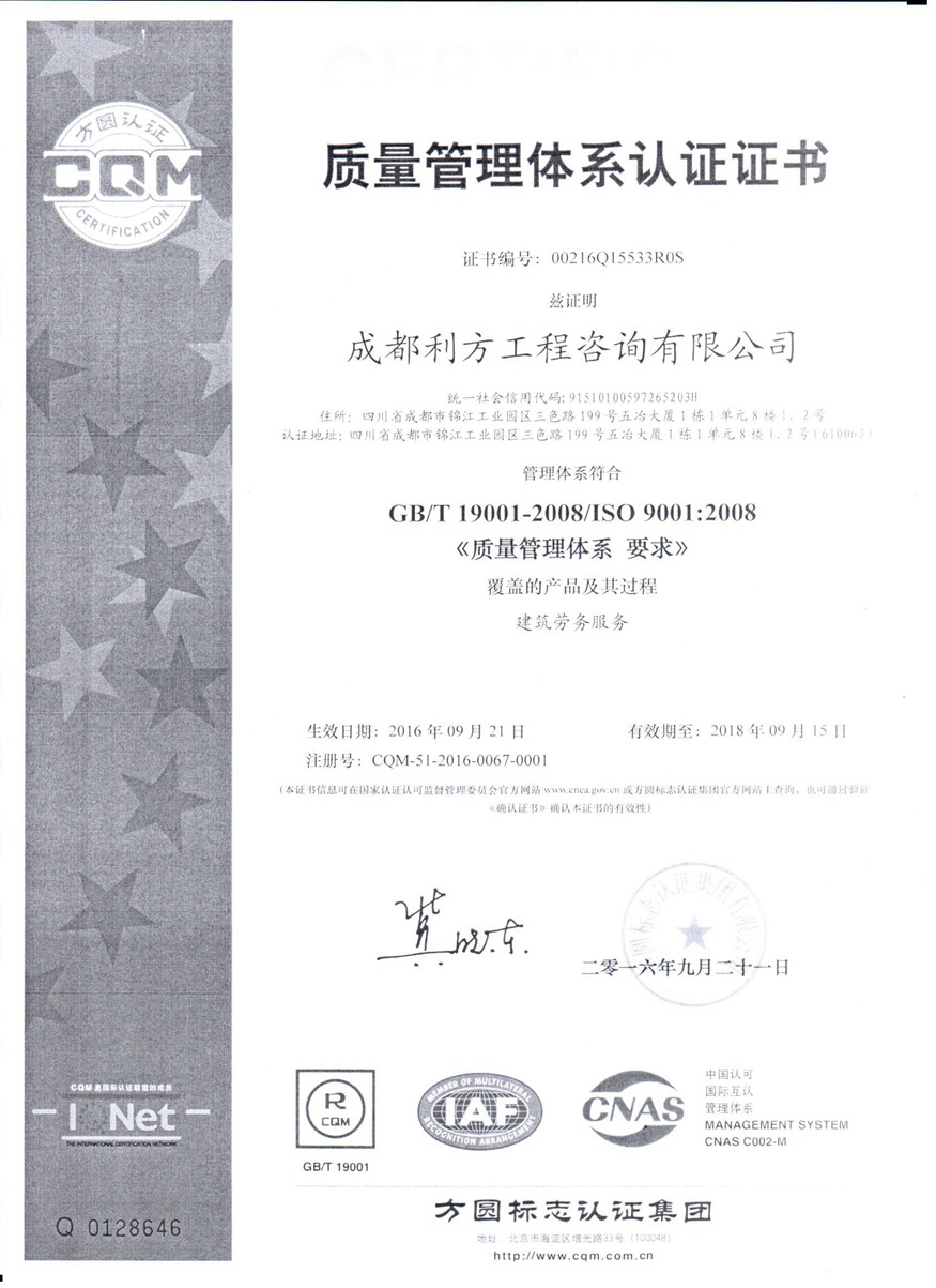 近日,成都利方工程咨询有限公司顺利通过了由方圆标志认证集团有限公司组织的专家考评和审核检查,并获得了由方圆标志认证集团统一颁发的GB/T19001-2008/ISO9001:2008 《质量管理体系认证证书》。