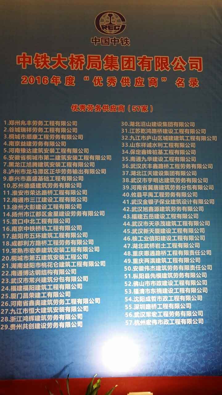 9月13日,在武汉世茂希尔酒店召开的中铁大桥局集团“优秀供应商”表彰大会暨展览会上,我公司被授予“优秀劳务供应商”荣誉奖牌。中铁大桥局集团充分肯定了我公司多年来诚信经营的理念,热情周到的服务和综合管理的实力,充分表明我公司已经成为中铁大桥局集团公司发展的重要合作力量,为中铁大桥局重大工程项目实施和企业持续健康发展作出了积极的贡献。