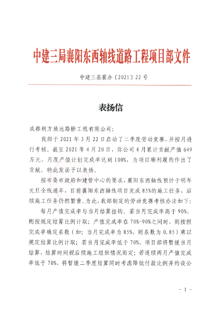 成都利方襄阳东西轴线项目荣获甲方项目部表扬信